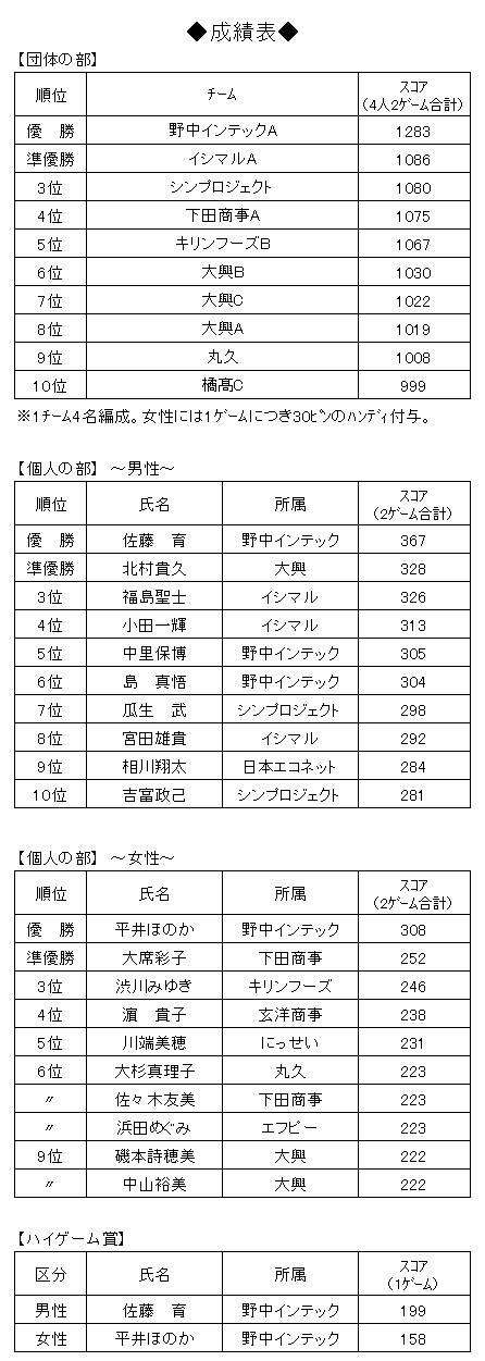 ▲団体上位10チーム 及び 個人(男女別)上位10名 並びに ハイゲーム